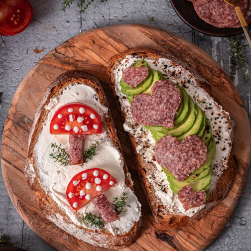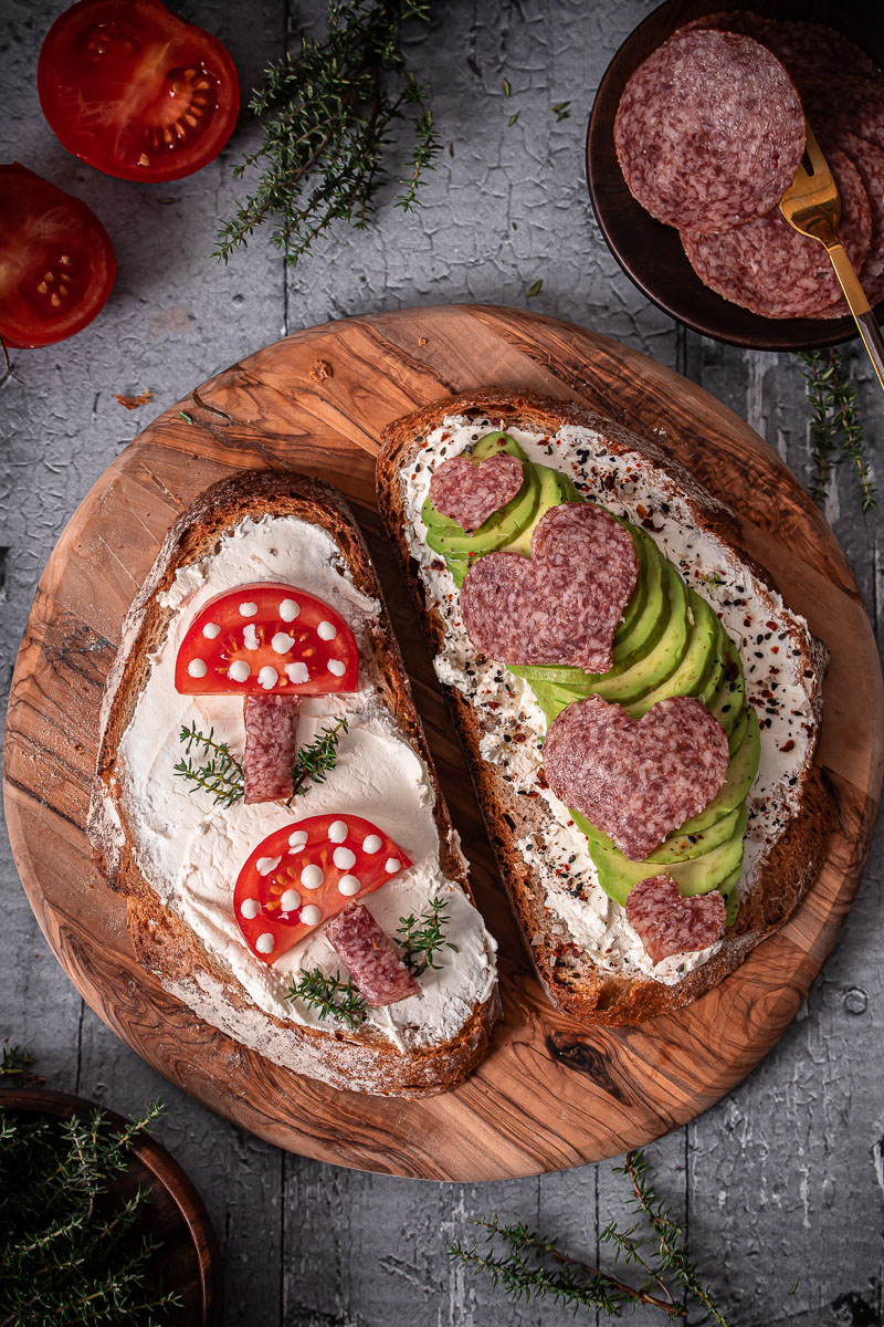 Noch einfacher, aber mindestens genauso schön: ein Brot mit Frischkäse und fein geschnittener Avocado. On top kommen Salamiherzen, die ihr ganz leicht mit einem kleinen Herz-Ausstecher aus den Salamischeiben zaubert.